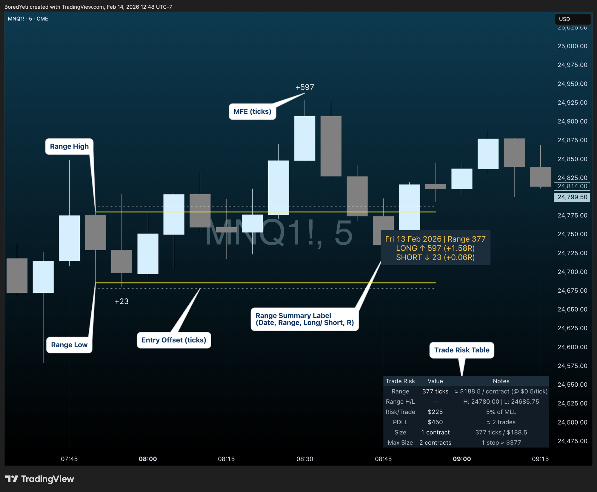 - MFE tracking: Prints post-range excursion as a simple number so you can gauge follow-through.