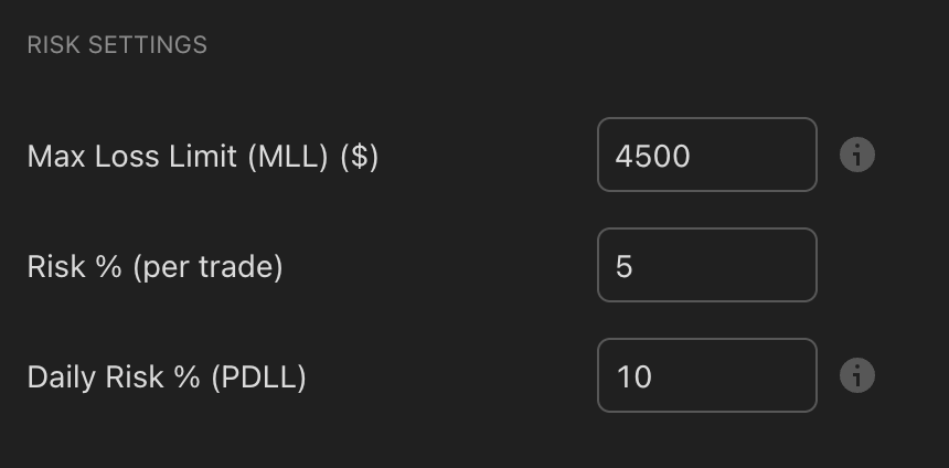 Example: MLL $4,500 × 5% = $225 Risk/Trade. MLL $4,500 × 10% = $450 PDLL.