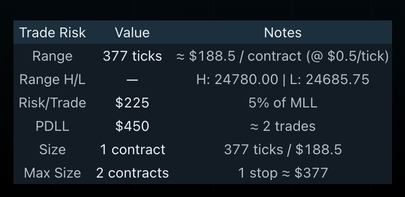 - Risk table: Shows $/tick and estimated $/contract impact for the current range, then calculates Risk/Trade, PDLL, and contract size.